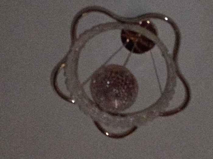 The image displays an upward-facing view of a ceiling-mounted light fixture, centered against a uniform light grey background. The fixture consists of a metallic, undulating, multi-lobed outer frame, possibly brass or bronze, reflecting multiple small points of light. Within this frame, a textured, spherical glass globe is suspended by thin wires or rods originating from a darker, circular mounting plate positioned above the sphere and partially obscured by the frame. The spherical globe also exhibits multiple small reflections, suggesting a sparkling or faceted surface. No people or specific actions are depicted. The background shows significant digital noise, characteristic of a low-light photograph. The precise location within Ijoko, Nigeria, cannot be determined from the visual information provided.