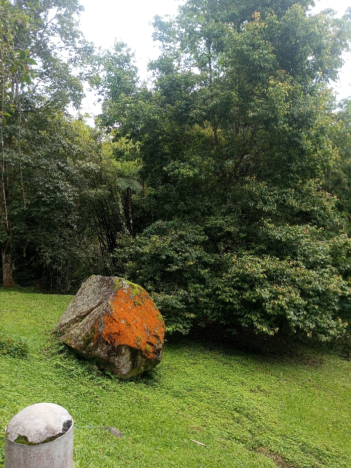 The scene depicts a natural, verdant landscape within the city of Kanand, India. In the immediate foreground, a weathered, light gray concrete post with a rounded top, showing minor moss growth, is positioned on the lower left. Directly behind and to its right, a large, irregularly shaped rock dominates the midground. This rock is primarily gray and brown, with a significant portion of its visible surface covered in vibrant orange lichen. The ground consists of dense, low-growing green vegetation, resembling a mixture of grass and small-leafed ground cover, which slopes gently upwards from the foreground towards the background. No people are present. The background is characterized by a dense, multi-layered collection of trees and shrubs, displaying various shades of green foliage. Taller trees form a canopy against a bright, overcast sky. Thin, vertical bamboo stalks are visible amidst the other vegetation in the deeper background, particularly towards the left-center. No actions or interactions are observed.