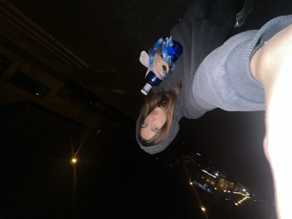 A dimly lit selfie-style photo captures a young woman in a gray hooded sweatshirt. She holds a blue water bottle with a colorful lanyard. The background is dark, with faint city lights visible in the distance. A street light shines on the left. The woman's gaze is directed at the camera. A partial view of her arm and hand are visible in the foreground.