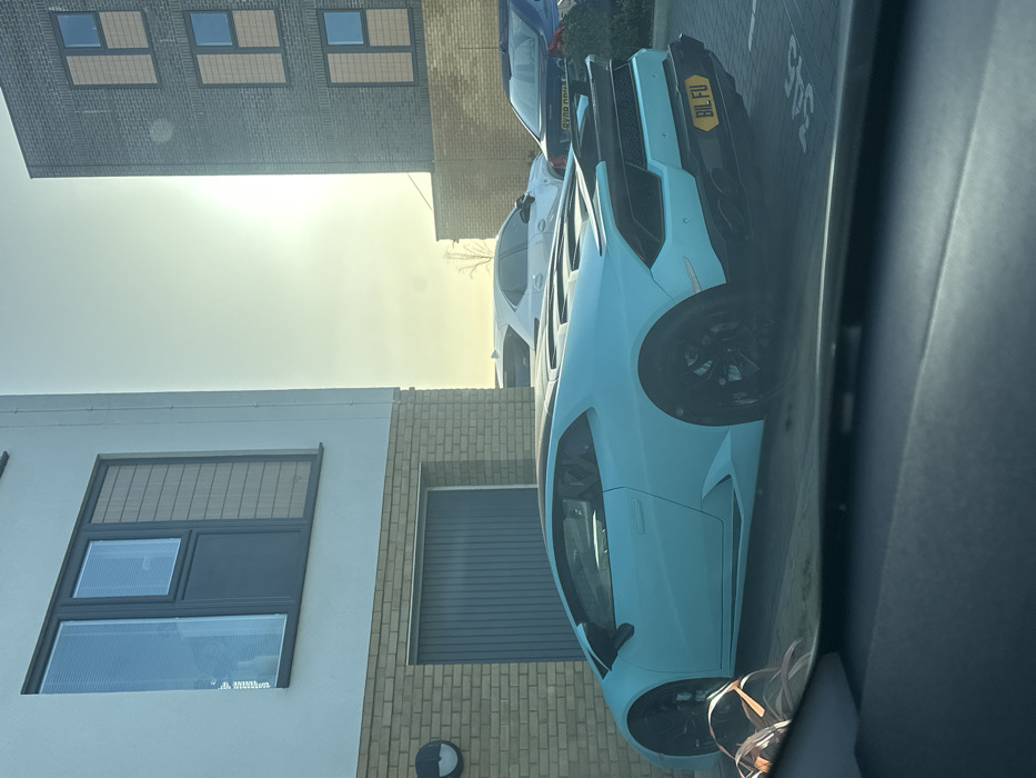 The scene is located in Gillingham, United Kingdom. A turquoise Lamborghini, identified as a Huracan model, is parked facing away from the camera in a paved outdoor parking area. The vehicle features a black roof, black multi-spoke wheels, a black rear spoiler, and a yellow UK-style private registration plate displaying "B1L FU" on its rear bumper. To the left of the Lamborghini is a modern residential building with a white render upper facade and a light brick lower section. It features a grey sectional garage door and a large window unit with internal horizontal blinds. A circular black wall-mounted light fixture is visible above the garage door. To the right, partially obscured by the first building, stands a taller, modern building constructed of dark brick. This building has multiple windows with a distinct grid pattern and lighter-colored panels. Behind the Lamborghini, a white SUV or crossover vehicle is partially visible, followed by a dark blue or black sedan with the registration plate "RY60 D**". The overall environment is brightly lit by the sun, which is low in the sky, causing some glare in the upper right portion of the image. The foreground of the image shows the dark dashboard or interior of the vehicle from which the photograph was taken. No individuals are visible.