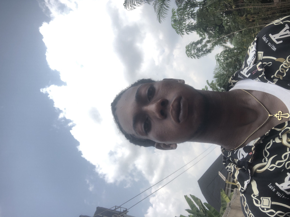 A young adult male, appearing to be of dark complexion, is depicted in a close-up, upward-angled portrait shot outdoors in Enugwu-Ukwu, Nigeria