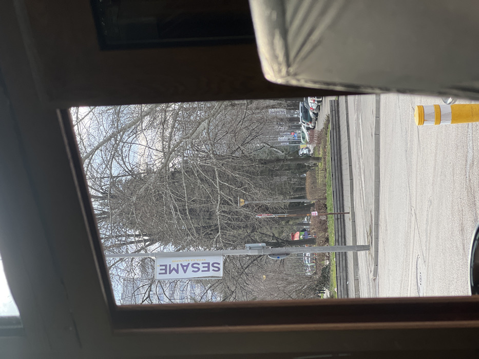 The image displays an outdoor urban scene in Pernik, Bulgaria, viewed through a brown rectangular window frame. The visible environment is consistent with the area near ul. "Krakra" 1, adjacent to a "Sesame" bookstore and a public park or green space. In the immediate foreground, parts of a dark brown or wooden window frame are present on the left and top edges. A light-colored, possibly reflective object is partially visible on the bottom right, and the top of a yellow and white striped bollard is seen at the bottom-center/right. Beyond the window, an outdoor street or intersection features a paved surface and concrete sidewalks. A tall metal light pole stands prominently on the left, bearing a white vertical banner. The banner displays "SESAME" in purple capital letters, with "КНИЖАРНИЦА" and "BOOKSTORE" in smaller blue text below. The midground transitions into a landscaped park area or green median, characterized by numerous bare deciduous trees and bushes, indicating a winter or early spring season. A traditional street lamp with an amber-colored fixture is visible on the right within the park's edge. Further back, a row of parked cars is visible along a street, partially obscured by the trees. Several indistinct human figures are walking in the distant park area. In the background, a tall, multi-story modern building with a glass facade is discernible through the bare tree branches on the left. The sky above is partially cloudy, displaying light blue and white tones.