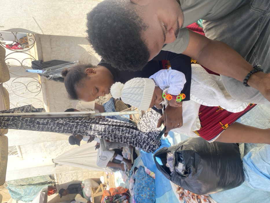 In Sabon Gari South, Nigeria, an outdoor scene unfolds under bright sunlight, indicative of a market or gathering area. In the immediate foreground, to the right, a man with dark, curly hair and a mustache is visible from the chest up, wearing an olive-green t-shirt and grey pants, looking downwards. A dark beaded bracelet adorns his left wrist. Adjacent to him, a woman with dark hair pulled back, dressed in a black top and a red and black patterned skirt, cradles an infant in her lap while looking down at a smartphone held in both hands. The infant wears a white cable-knit beanie with a pom-pom, a white long-sleeved garment, and a white lower covering, with its left hand clutching a colorful segmented toy featuring yellow, green, and orange elements. The infant also appears to be looking towards the smartphone. The ground in the foreground is covered by a blue tarp, upon which a full black plastic bag rests to the left of the woman and infant. In the midground, several individuals are present; one person in a black baseball cap and light-colored attire is seated barefoot, engrossed in a smartphone. Behind them, other figures are seated amidst various textiles and bundles, including a person in a grey long-sleeved shirt. Overhead, a dark, patterned fabric hangs from a pole, and a light-colored canopy or umbrella, partially obscuring text like "Diot" and "Extra," provides some shade. The background features a light-colored building with decorative wrought iron elements on a window or railing.