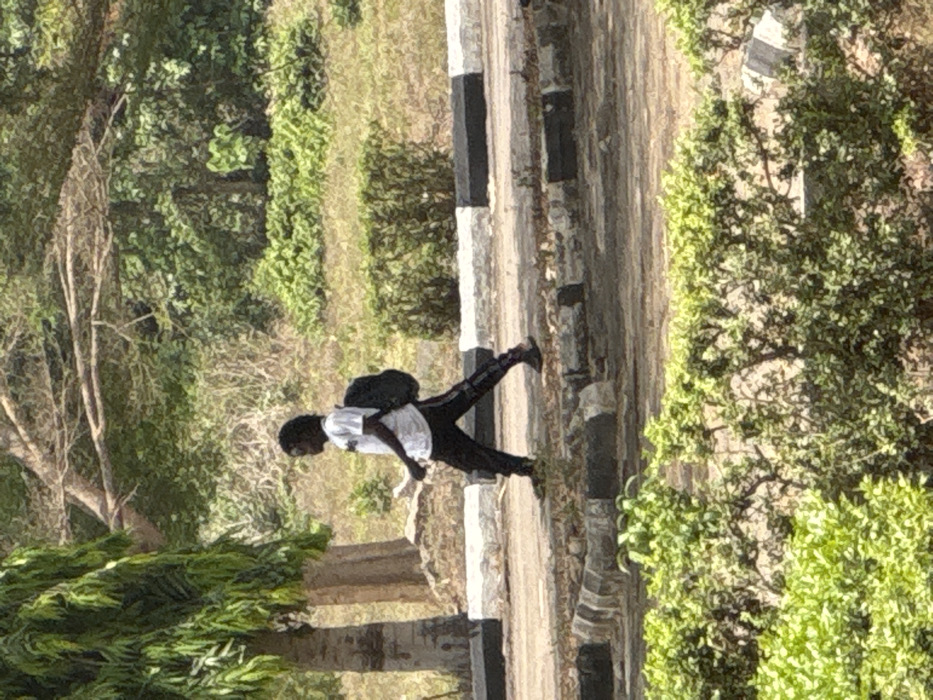 The scene depicts an outdoor environment in Osu, Nigeria. A dark-skinned male individual, with shoulder-length dark hair, is captured in profile, walking from the right side of the frame towards the left. He wears a white short-sleeved t-shirt, dark athletic pants with a light-colored stripe down each outer seam, and dark athletic shoes. A black backpack is worn on his shoulders, and a small, rectangular white object is held in his left hand. The individual is on a paved surface, which is bordered by a concrete curb painted with alternating black and white segments. Beyond the curb, the ground features sparse, dry grass, scattered green bushes, and numerous trees with vibrant green foliage, indicating a natural or park-like setting. The overall scene is brightly illuminated by natural daylight.
