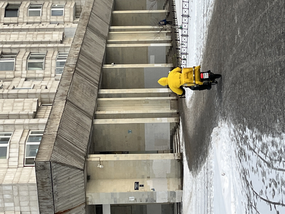 This image captures a winter scene on Universitetskaya Embankment, 7-9, in Saint Petersburg, Russia, featuring the Saint Petersburg State University building. A person is riding a black motor scooter or moped, observed from the rear, along a curved, partially cleared asphalt path. The individual wears a bright yellow hooded jacket, dark gloves, and dark trousers. A large, yellow square delivery bag, bearing what appears to be a "Yandex Eda" logo, is affixed to the rear of the scooter. The scooter's red license plate displays "УА8 05М". Snow covers the ground bordering the asphalt path, with the path itself appearing damp or icy in sections. To the right, a low black metal fence separates the path from a snow-covered area. The background is dominated by a large, multi-story concrete building, which a sign on a left column identifies as "УНИВЕРСИТЕТ" (University). This structure features a prominent overhanging portico supported by multiple light-colored square columns. The underside of the portico exhibits a distinct diagonal slat pattern. Several security cameras are mounted on the columns and building facade. Above the portico, the building displays a repetitive pattern of rectangular and bay windows. In the far right background, a second, smaller individual, dressed in a dark blue jacket, is visible walking up a set of snow-covered steps towards an entrance. The sky is overcast, indicating diffused lighting.