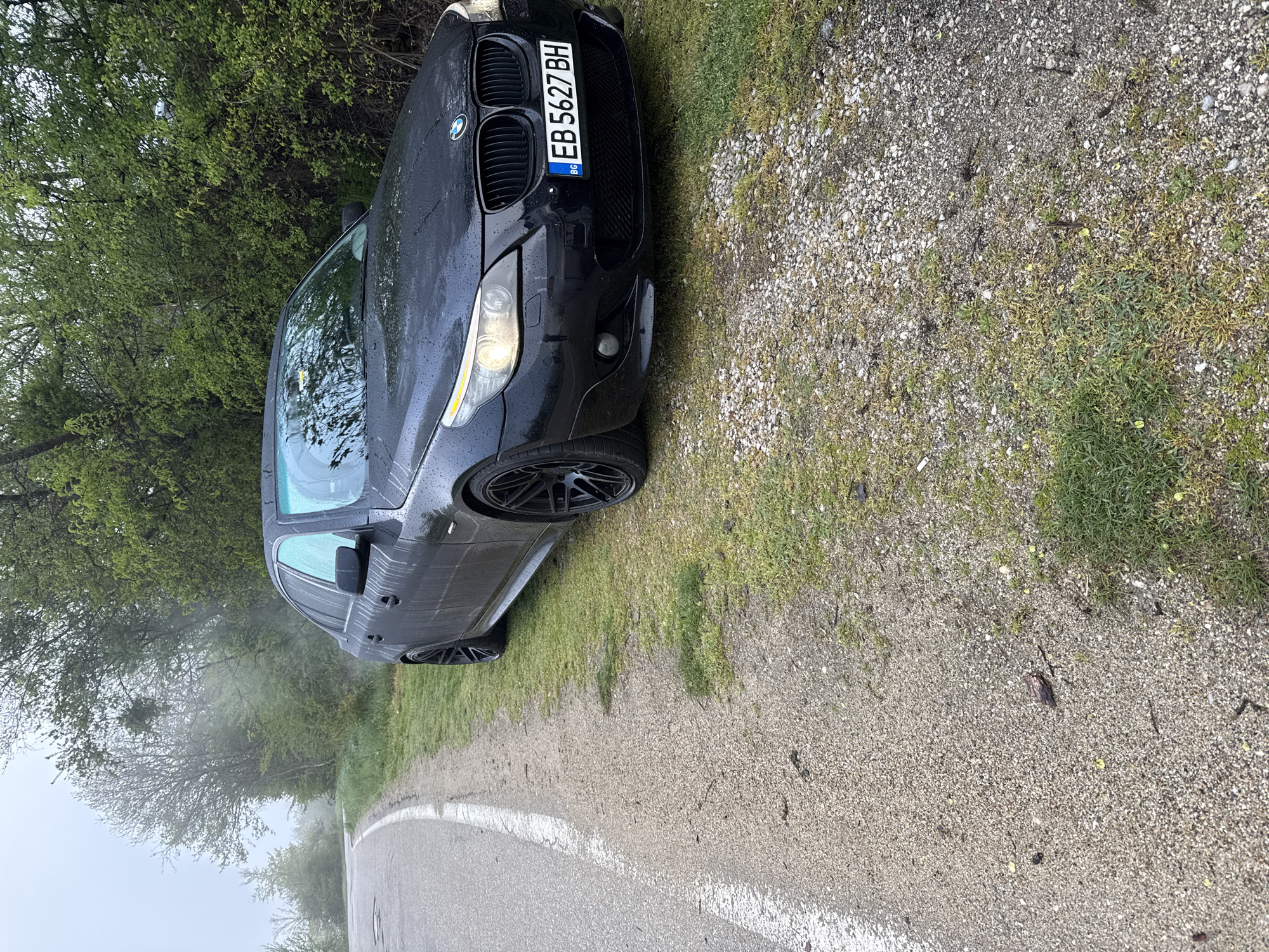 The image depicts a black BMW parked on the shoulder of a road next to a patch of grass and gravel. The car's front end is angled towards the camera, and the license plate is visible, reading "EB 5627 BH". The car appears to be in Balinovtsi, Bulgaria, based on the license plate's country code. The road is wet, and the sky is overcast with some fog in the distance. The background includes trees and foliage, suggesting a rural or semi-rural environment. The overall scene appears to be a roadside setting with the parked vehicle as the main subject.
