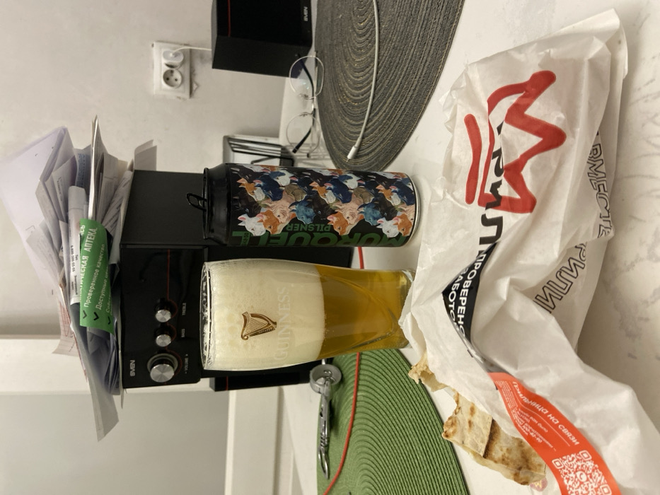 The image displays an indoor tabletop scene in Krasnoyarsk, Russia. A white countertop features a partially unwrapped white paper package from 'ШашлыкоFF' (ShashlykoFF), containing a flatbread-wrapped food item. A red label with a QR code and Russian text is visible on the wrapper. A half-full Guinness glass containing a light amber liquid with a foamy head sits on a green woven placemat. Adjacent to the glass, a black can labeled 'MORQUELL PILSNER,' adorned with a pattern of stylized dog faces, stands upright. A metal corkscrew and a red cable are partially visible on the green placemat. In the background, a black 'SVEN' audio speaker unit with volume, bass, and treble controls is present. A stack of papers, including a green-labeled document referencing a 'Verified Pharmacy' in Russian, is piled on the speaker. To the right, a pair of eyeglasses and a white charging cable rest on a gray woven placemat. A smaller black 'SVEN' speaker is positioned to the far right. A white wall with a double electrical outlet is visible in the background.