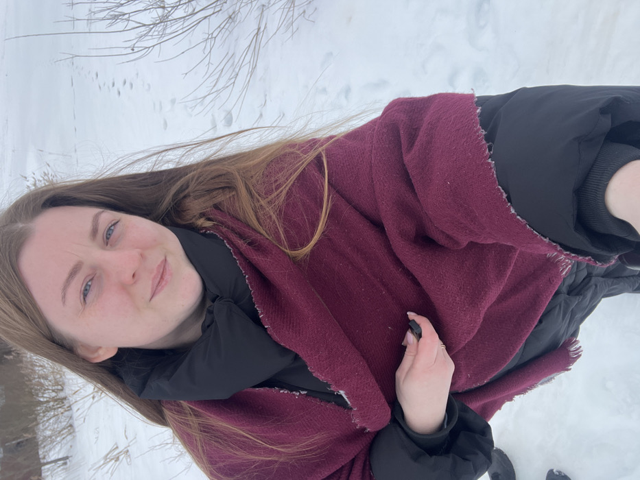 The image presents a high-angle selfie of a female subject outdoors in a snow-covered environment, identified as Kalinino, Russia. The subject is a young adult female with long, light brown hair, blue eyes, and fair skin, exhibiting a slight smile while looking directly at the camera. She is dressed in a black puffer jacket, over which a textured, maroon-colored shawl is draped. Her left hand, adorned with a silver ring on the ring finger, is positioned near the center-left, holding a small, dark, irregularly shaped object between her thumb and index finger. The background consists of a uniformly snow-covered ground extending into the distance, with sparse, bare-branched shrubs and dried vegetation protruding from the snow. Faint footprints are visible in the snow towards the right side of the frame. The lighting is soft and diffused, suggesting an overcast sky.