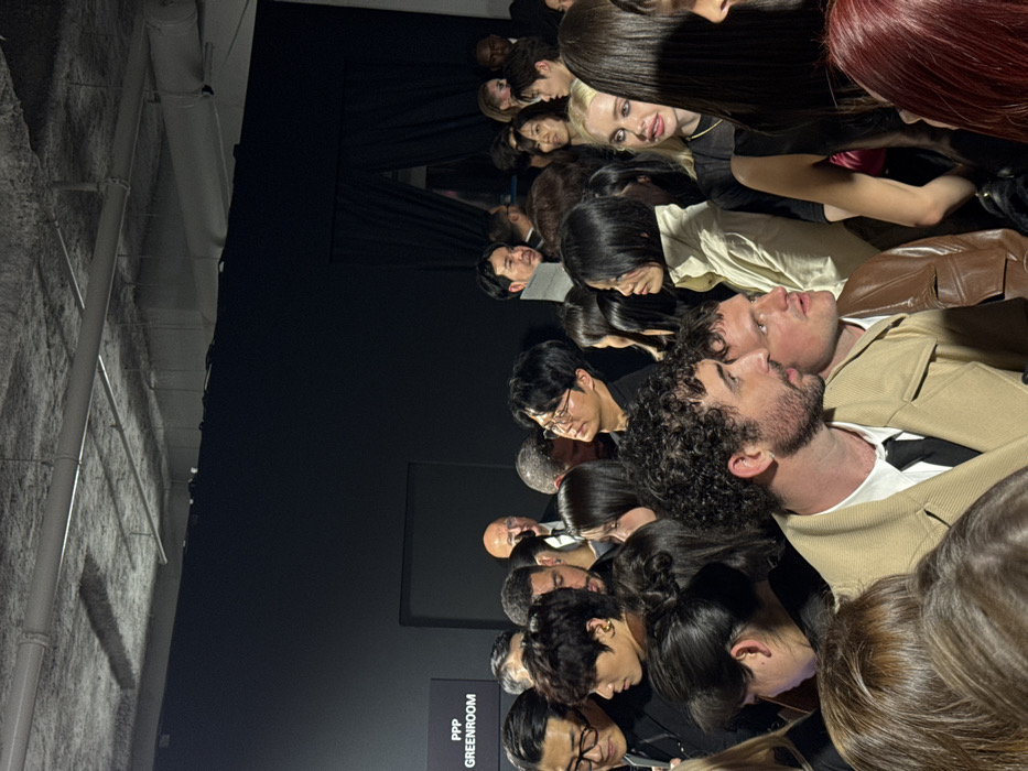 The image captures a densely populated indoor scene within a greenroom in Paris, France. Numerous individuals are closely grouped together, filling the majority of the frame. The setting features dark, presumably black, walls and a grey concrete ceiling with visible white pipes and conduits running across it. On the left wall, a white sign with black text reads "PPP GREENROOM." A dark, pleated curtain is visible on the upper right side of the background. In the foreground, a man with curly dark hair and a beard wears a tan trench coat over a white shirt and black tie, his gaze directed towards the right. To his immediate right, actor Josh Hutcherson is visible, wearing a brown leather jacket and also looking towards the right. Further to the right, actor Hunter Schafer is present, characterized by blonde hair, a dark top, and a slightly open mouth, her attention directed towards the right. A person with long red hair is partially visible at the far right edge of the frame. Behind the man in the trench coat, a woman with short dark hair and a light-colored collared jacket stands, looking forward. The assembled individuals exhibit diverse appearances, hairstyles, and attire; several wear glasses. An older bald man in a suit is identifiable in the background. The primary action involves individuals standing and observing, with many appearing to focus their attention towards an area outside the right side of the frame. The scene conveys a crowded, anticipatory atmosphere within a functional interior space.