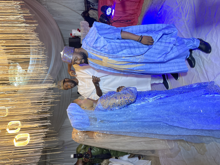 A wedding scene captures a couple standing closely, both adorned in light blue attire. The man wears a traditional embroidered gown and a matching cap, while the woman is in an embellished gown with a sheer veil. Another man in white stands to the side, observing the couple. A photographer is at the base. Decorative lighting and draping add to the ceremonial atmosphere.