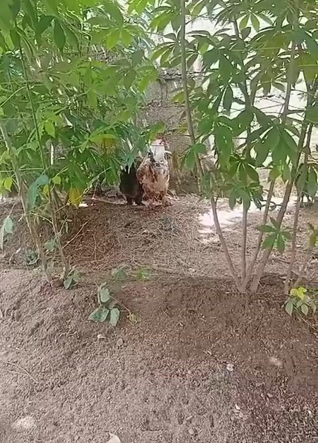 small patch of dirt between some green trees. Two chickens stand under the trees. The chicken in the foreground is brown and white. The other chicken is black. A white wall is visible in the background.