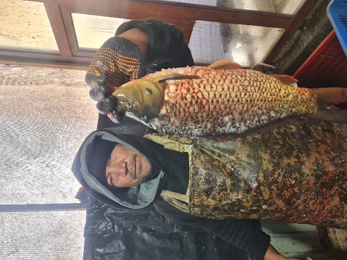 The scene depicts a male individual in a fish processing area located in Qorowul, Uzbekistan. The man, appearing middle-aged with a short beard, wears a black hooded sweatshirt over a dark beanie, a heavily stained digital camouflage pattern apron, and a black and orange work glove on his right hand. He is holding a large, freshly caught or prepared fish vertically by its head with his gloved hand. The fish exhibits prominent orange-yellow scales along its body and a darker olive-green head. In the background, to the man's left, is a dark, possibly tarp or plastic sheeting surface with visible residue. To the right, behind the fish, is a multi-pane window with dark frames, showing a blurred exterior view. Partially visible below the fish are a red plastic crate and a blue plastic crate.