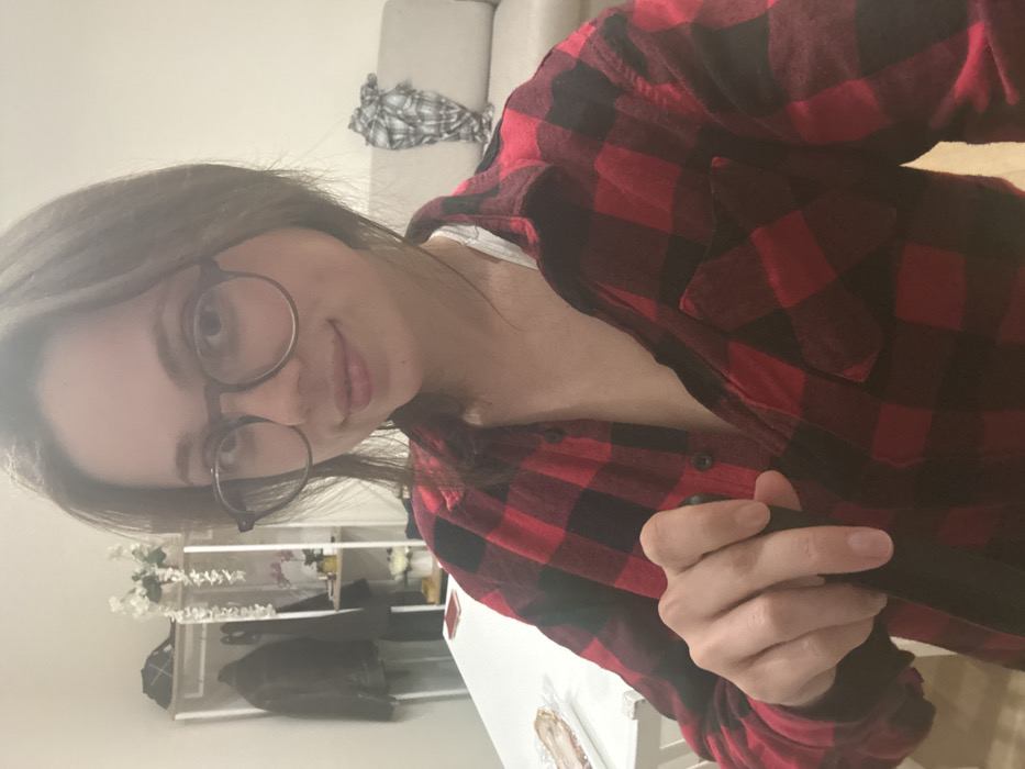 A female individual is captured in a close-up, chest-up indoor selfie. She possesses shoulder-length dark hair and wears dark, round-framed eyeglasses, displaying a slight smile. Her attire consists of a red and black plaid flannel shirt, unbuttoned at the collar to reveal a lighter-toned undershirt. Her right hand, positioned in the foreground, grasps a dark, slender cylindrical object. The background reveals a residential interior. To the left, a white dining or work table is partially visible, holding a red rectangular item and a clear plastic-wrapped package containing slices of meat. Behind the table, a white garment rack or shelving unit holds a dark jacket, a light-colored hat, and is decorated with white artificial flowers. To the right, a light-colored sofa is visible, upon which a crumpled plaid shirt, distinct from the one worn by the subject, rests. The walls are light-colored. The ambient lighting suggests an indoor artificial light source. No visual cues within the image provide specific geographic identifiers to confirm a location within the city of Scafati, Italy.