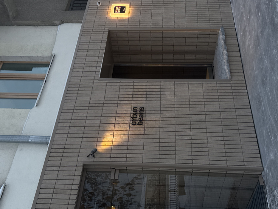 The image displays the exterior of the "urban beans" establishment located in Yekaterinburg, Russia. The lower portion of the building's facade is uniformly clad in light brown, vertically oriented rectangular tiles, presenting a textured surface. Above this tiled section, the building transitions to an off-white painted upper story, featuring a silver vertical downspout on the left and a window with a light-colored wooden frame. An adjacent, darker grey building with a security gridded window is visible on the far right. The name "urban beans" is rendered in black, sans-serif lettering mounted directly onto the tiled facade. Above this text, a black cylindrical spotlight emits a warm yellow light downwards, illuminating the sign. To the right of the wall-mounted sign, a recessed entrance is visible, featuring a dark interior and a raised, rough-hewn grey stone threshold. Further to the right of the entrance, a square, internally illuminated sign, also displaying "urban beans" in black text, emits a warm yellow glow. A small white dome-shaped security camera is affixed to the tiled wall above and to the right of this illuminated sign. To the left of the "urban beans" wall sign, a large glass panel or door extends to the ground, reflecting bare tree branches and a snow-covered ground surface, suggesting winter conditions. A metal drainage grate is present at the base of this glass panel. The ground in front of the building is dark, possibly asphalt or concrete, with a thin, uneven layer of white snow or frost. No individuals are visible in the scene.