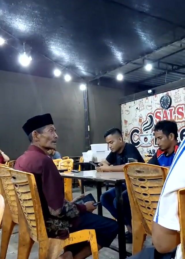 four men sitting at tables in an indoor café or restaurant. The man closest to the camera wears a maroon shirt, black pants, a black peci hat, and slippers. He is looking to his right and talking, while holding a tablet. Another man sits across the table from him, looking at a smartphone. To his right, a third man in a blue shirt looks on. The fourth man is partially visible on the right, wearing a white shirt and black pants. The café is dimly lit by several visible overhead lights. The tables are black and the chairs are yellow. A wall in the background has a mural with coffee-related images and the words "Salsa Coffee".