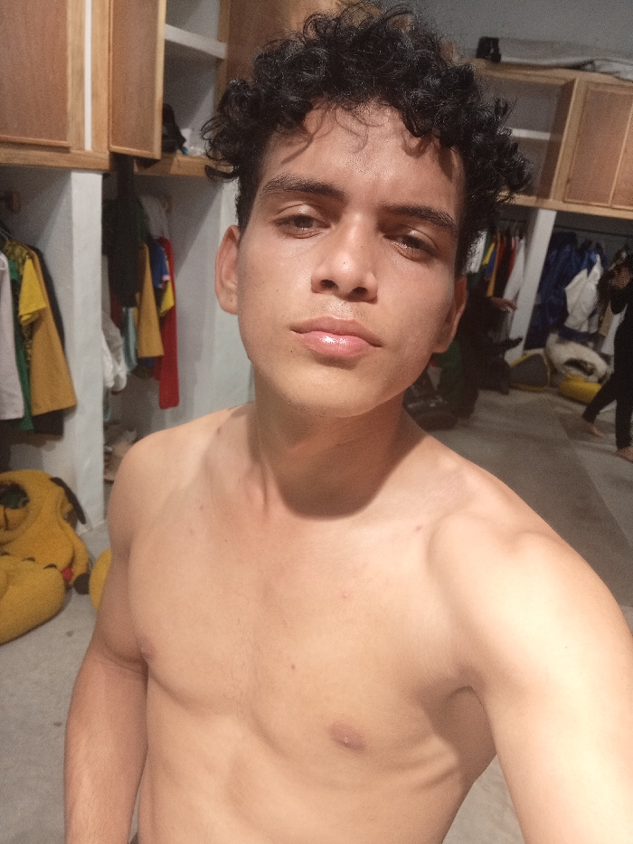 A shirtless young man with curly dark hair stands in a room. He has a light complexion, a small nose, and full lips. Behind him is a closet with clothes hanging. There's a yellow stuffed animal on the floor to the left, and in the background to the right, there are two figures. The room seems to be a changing area or storage space with cabinets. The lighting is a bit uneven, casting shadows on the man's body.