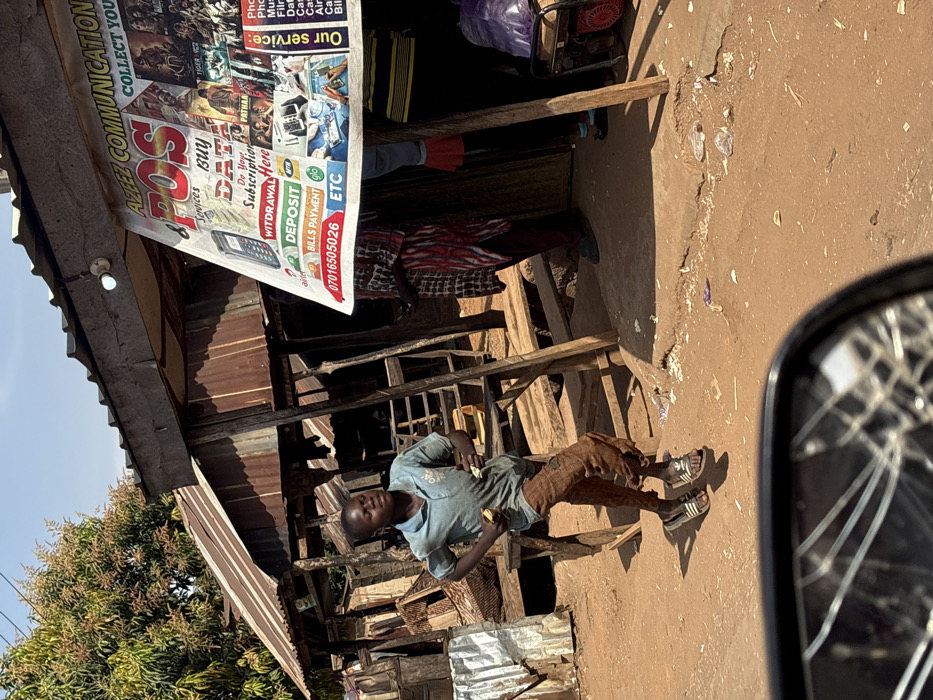 The image depicts a daytime street scene in Tataura, Nigeria. A young male, appearing approximately 8-12 years old, with dark skin, is in motion on an unpaved reddish-brown dirt road. He wears a light blue collared shirt, dark brown, possibly distressed trousers, and striped slide sandals, holding a small light-colored object in his left hand. To the left, multiple rudimentary structures with corrugated metal roofs and wooden supports are visible. To the right, a vendor stall features a large white banner for "AZEEZ COMMUNICATION & POS," advertising services including data, withdrawals, deposits, phone, music, film, and cable, with a contact number (07016505026). A bare lightbulb hangs from the stall's overhang. Two partially visible individuals are present behind the stall counter; one wears a red and white patterned garment, the other a black and yellow striped garment. A red portable generator and a purple plastic bag are on the ground near the stall entrance. Green foliage is visible in the background. The foreground includes a partially visible, cracked vehicle side-view mirror in the lower left.