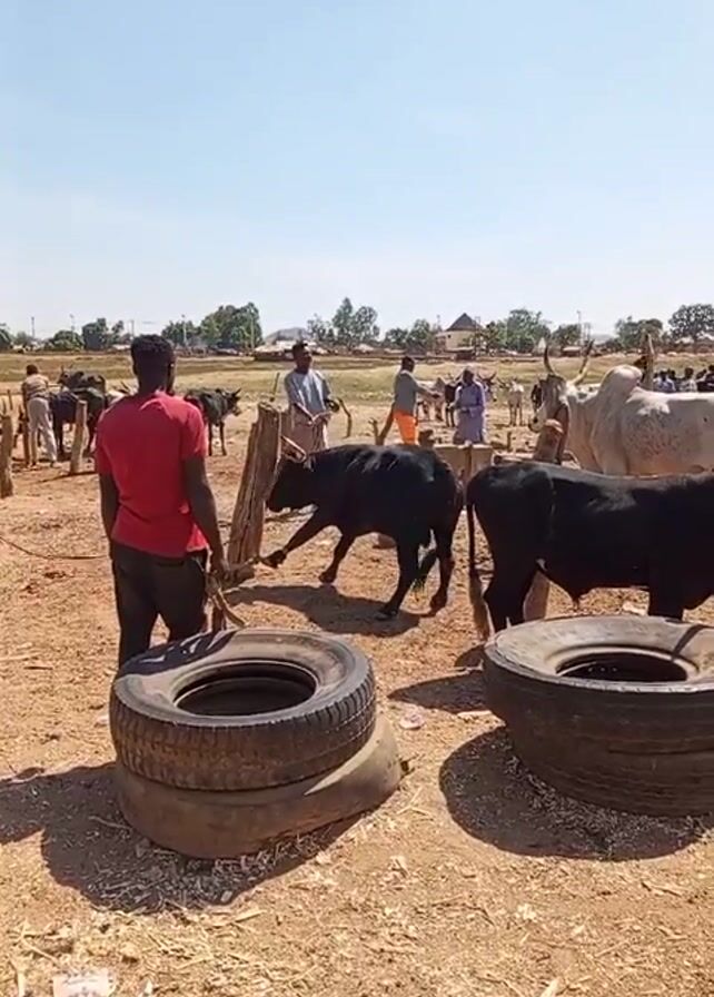 sunny outdoor scene with several people and cattle in a fenced area, suggesting a livestock market or farm. In the foreground, there's a man in a red shirt and dark pants standing near stacked tires. He is holding a wooden pole or stick. In the center, a man is leading a black bull with a rope. There are other bulls and cattle in the background. Several other men are standing around the area, some holding sticks. The ground is dry and dusty, and there are a few scattered buildings and trees in the distant background. The sky is clear and blue.