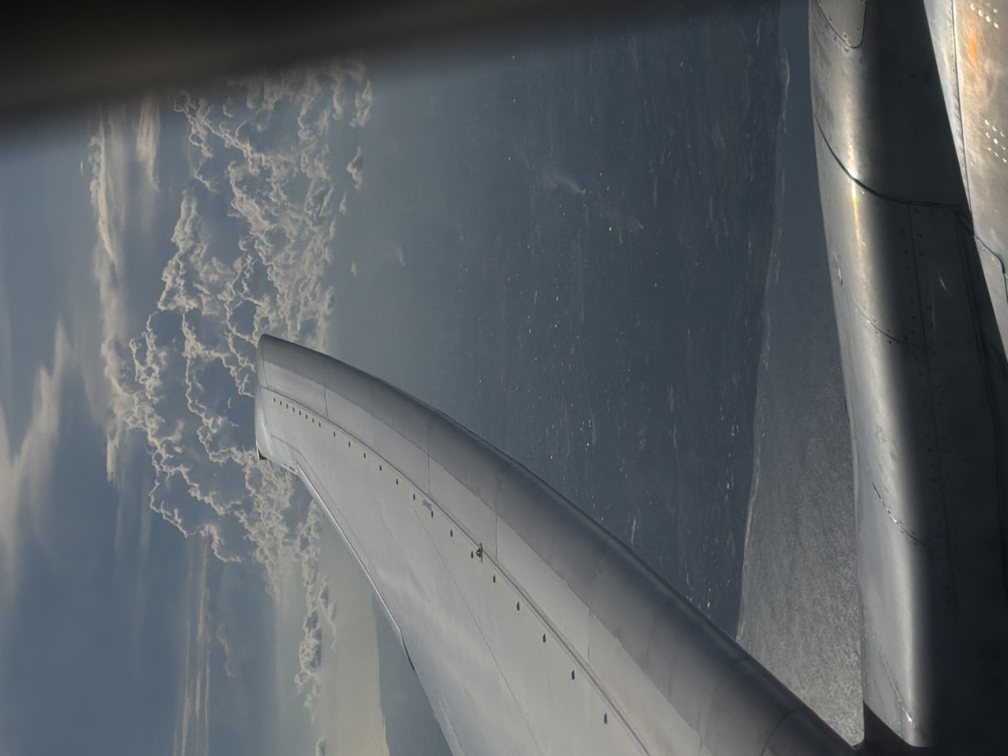 A view from an airplane window shows a wing with visible rivets and metal paneling