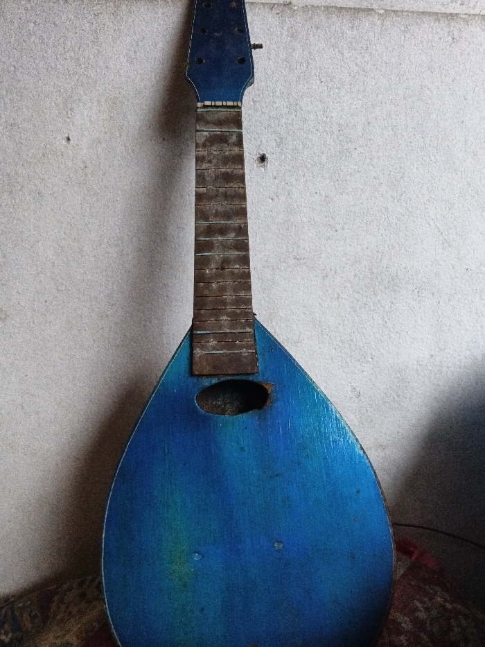 A distressed, blue, stringed instrument leans against a wall. Its teardrop-shaped body has a hole where a soundhole would typically be. The fretted neck is heavily worn, with rust-colored discoloration. The headstock, also blue, appears to be missing some tuning pegs. The instrument displays significant signs of age and wear.