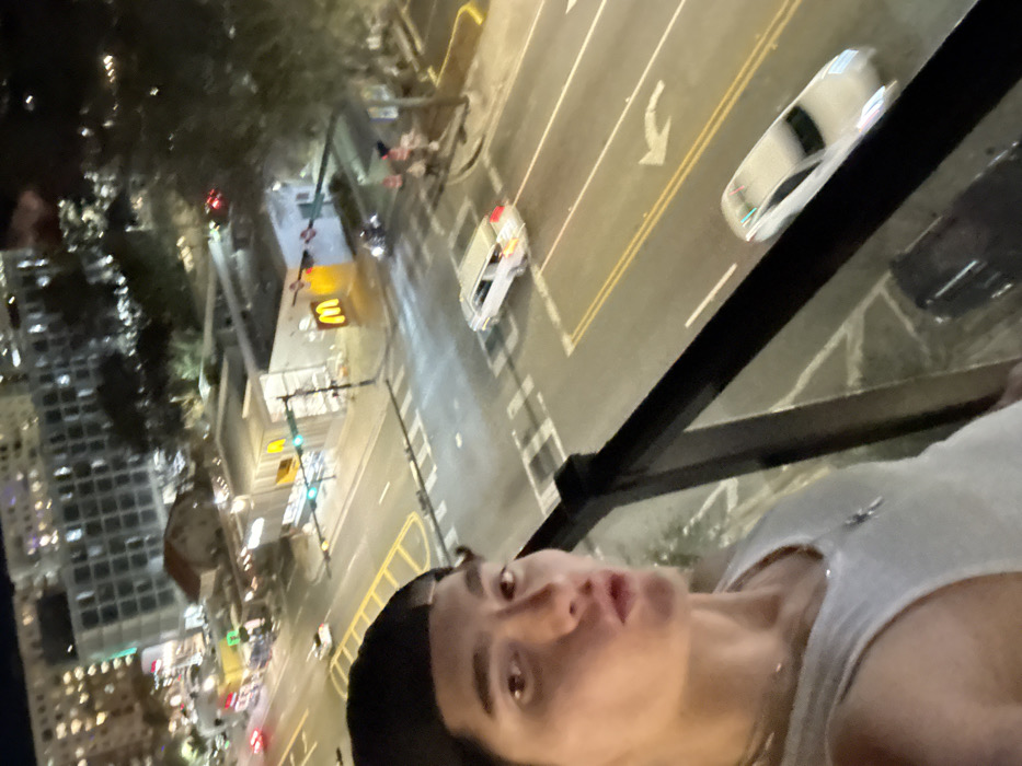This nighttime image captures an elevated view of a bustling urban intersection in Gainesville, Florida, specifically at East University Avenue and South Main Street. In the lower-left foreground, a male subject is visible, taking a selfie. He has dark hair, wears a dark baseball cap backward, and a white tank top with a silver necklace and pendant. His lips are pursed, and his eyes are open, directed towards the camera. A black railing with a transparent panel runs horizontally across the mid-foreground, separating the subject from the street scene below. The illuminated intersection below features a prominent McDonald's restaurant on the corner, characterized by its single-story, light-colored structure and two distinct yellow "M" logos. Traffic lights are visible at the intersection, with one appearing green for through traffic. The asphalt road displays white lane lines, crosswalks, and a painted white left-turn arrow. Several vehicles are present: a white sedan, possibly a taxi or ride-share vehicle with indistinct markings, is centrally positioned in the intersection. Another white sedan is further down the street, and a motorcycle or scooter is visible near the McDonald's, accompanied by two individuals on the sidewalk. Additional vehicle lights are blurred throughout the streetscape. The background reveals a dense urban environment with numerous multi-story buildings, their windows illuminated, under a dark night sky. Streetlights and building lights provide primary illumination for the scene. Trees are interspersed along the streets and among the buildings.