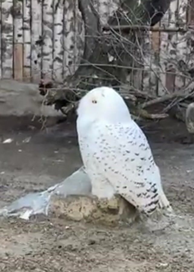 A video shows a white snowy owl with small black spots, perched on a gray stone in what appears to be an outdoor enclosure. The owl has yellow eyes and is mostly white. Behind it is a wooden fence and a small tree with bare branches. Another white owl can be seen perched on the tree in the background. The ground around the owl is sandy. A person is heard exclaiming in Russian, seemingly admiring the owl.