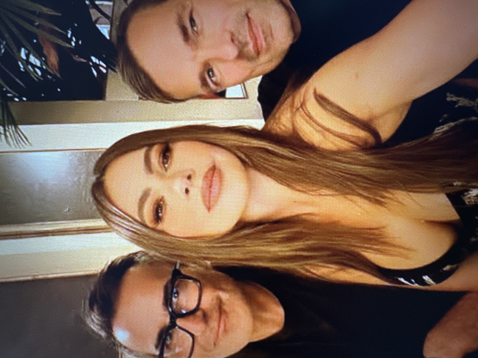 Three fair-skinned individuals are closely posed for a selfie-style shot, tilted slightly. A woman with long, light brown hair and full makeup is centered. A man with short hair and a neutral expression is above her, and another man wearing glasses is below. All three appear to be wearing dark clothing. In the background, a glimpse of a plant and a neutral-toned wall is visible.