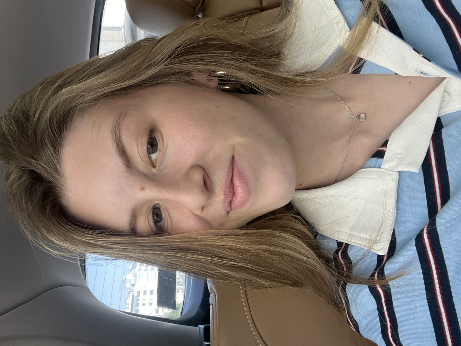 A young woman with light brown hair, fair skin, and neutral expression is shown. She wears a striped light blue and white shirt with a white collar. A delicate silver necklace adorns her neck. The background suggests she is inside a vehicle, with tan leather seats and a partially visible window showing a building outside. The image is a selfie-style composition.