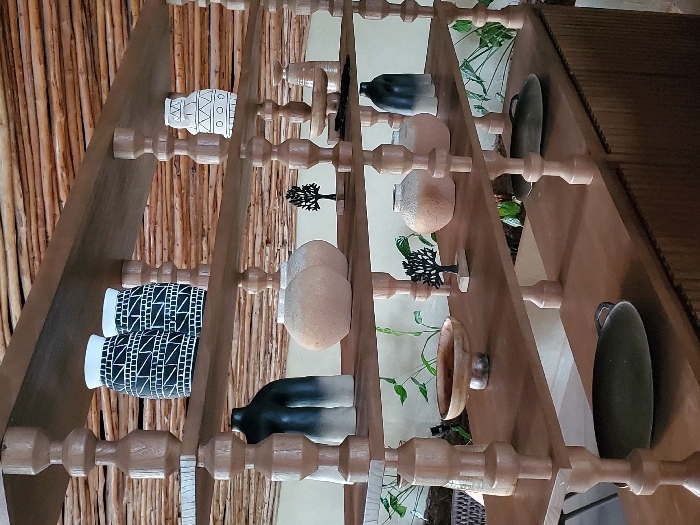 A tilted view of a decorative wooden shelf displays a collection of pottery and natural elements. The shelf has ornate wooden poles supporting its structure. The pottery includes vessels with geometric patterns, neutral-toned spherical pieces, and bowls. A small, stylized tree sculpture sits on one shelf. Green plants are interspersed among the items, adding a touch of nature. The backdrop features a textured wall made of thin, vertical wooden pieces.