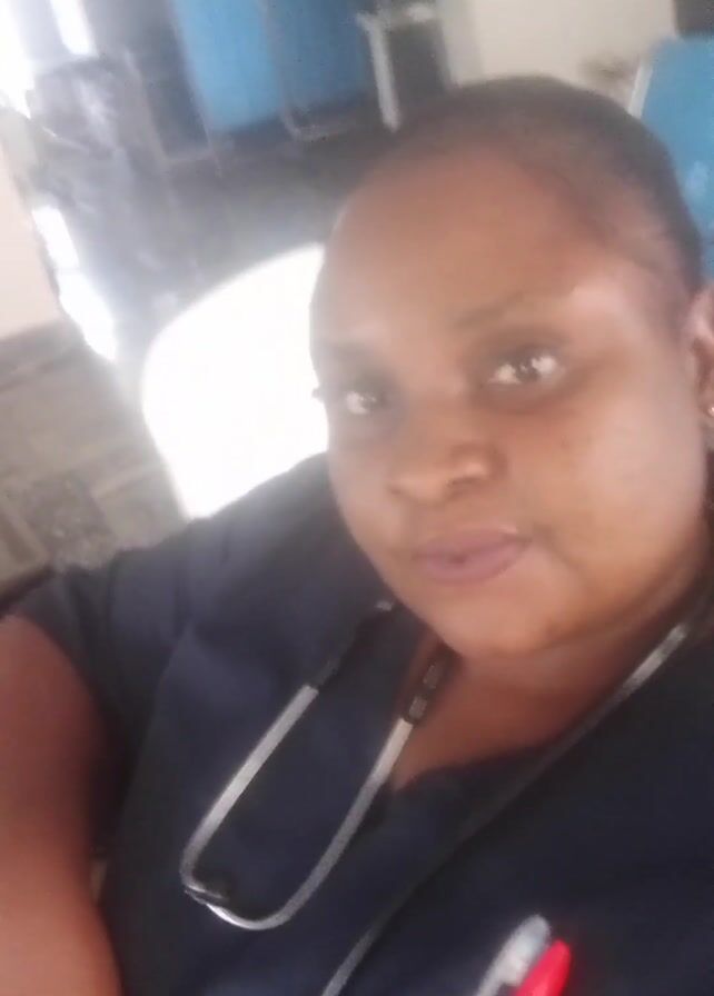 A close-up shot shows a woman wearing a navy blue medical uniform with a stethoscope around her neck. She is looking directly at the camera with a slight smile. A red pen is clipped to her uniform. The background includes glimpses of a white chair, a blue object that could be a medical device, and a tiled floor. The lighting is somewhat bright, suggesting an indoor setting.