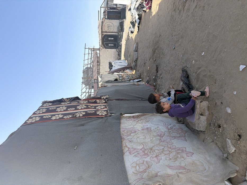 The image depicts an outdoor scene in the City of Gaza, Unknown, under a clear blue sky. Two young boys are seated in the foreground on sandy, uneven ground. The boy on the left, wearing a purple hooded sweatshirt, dark pants, and pink shoes, sits on a light-colored concrete block. The boy on the right, wearing a light-colored patterned shirt and dark pants, sits directly on the ground beside him, holding an object near his mouth. Both boys are looking towards the right, out of frame. To their left, a makeshift structure is visible, constructed from various materials. The lower section of the wall closest to the viewer is covered with a large piece of light-colored fabric or mattress material featuring a faded pink floral pattern. Above this, a dark grey tarp or blanket is stretched across. Further along this structure, a dark striped fabric or rug with light-colored floral patterns hangs vertically. Other rudimentary shelters, constructed from tarps and fabrics, extend along the left side into the midground. In the midground to the right, a permanent building with light-colored walls, possibly damaged or under construction, is visible. It features a decorative arched entrance with dark double doors and a circular sign above the entrance reading "NAEL COFFEE". Exposed rebar or scaffolding is present on the roofline of this building. The ground throughout the scene is barren dirt or sand, scattered with small rocks and debris, including a black plastic bag near the children. The sky is clear and cloudless.