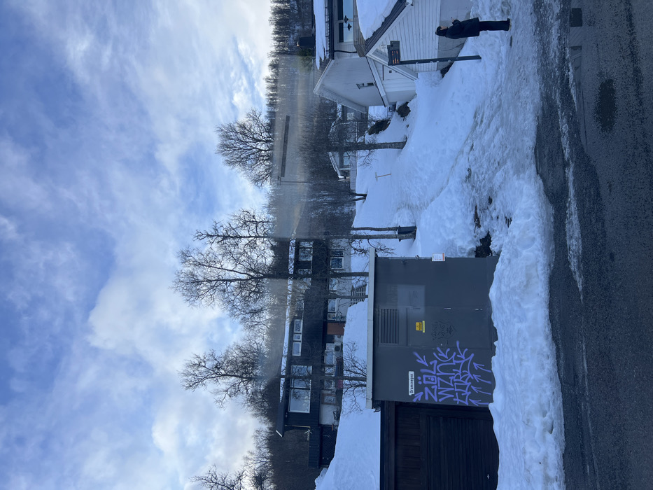 The image captures a winter scene on Bramsørgen street in Tromsø, Norway, under a blue sky with scattered white clouds. The foreground shows a dark asphalt road with patches of snow and meltwater. A gray utility box, tagged with purple graffiti reading "ZÖL WZNG" and displaying a "Bramsørgen" street sign, is prominent on the left, next to a dark wooden structure. Deep snow drifts accumulate along the roadside. In the midground, a snow-covered pathway ascends a slope, bordered by bare deciduous trees. A dark-colored, multi-story residence with numerous windows is visible uphill on the left. To the right, a white single-story house with a snow-covered roof is partially visible, adjacent to a white, vertical signpost. One individual, dressed in dark attire, stands near the white house on the right, facing towards the left side of the frame while appearing to hold an object to their ear or face. The background consists of a snow-covered hillside densely covered with bare trees. A horizontal light reflection is evident across the central portion of the image, indicating the photograph was taken through glass.
