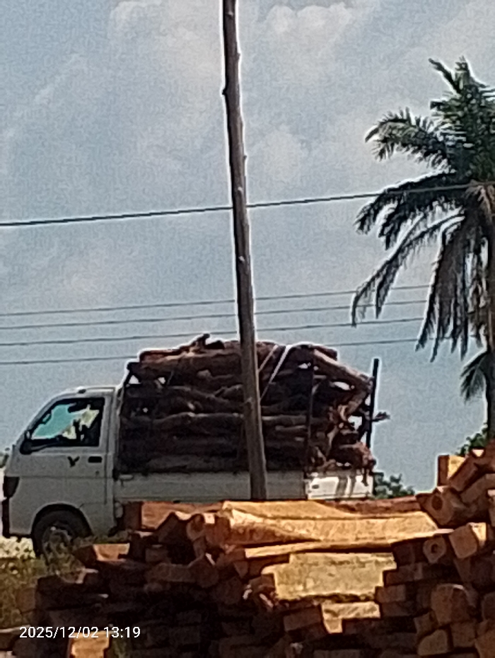 The scene in Sanioko, Nigeria, depicts an outdoor area related to timber processing or transport