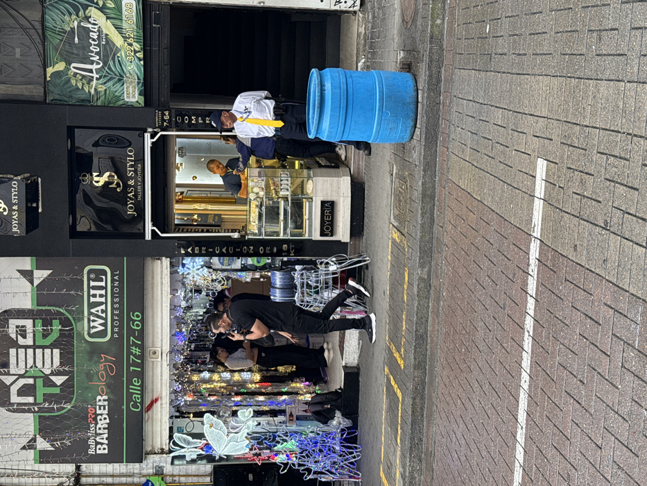 An urban street scene is depicted in Perimetro Urbano Pereira, Colombia, specifically on Calle 17 between building numbers #7-66 and #7-64. The foreground shows a brick-patterned street with a white dashed line, separated by a curb from a gray paved sidewalk. Two commercial storefronts are visible. On the left, a shop with a black facade features signs for "BabylissPRO BARBERology," "WAHL PROFESSIONAL," and "NEA TEC," with the address "Calle 17 #7-66." Its open entrance is brightly lit by numerous hanging decorative lights, including blue and white butterfly shapes and multicolored vertical strands. Inside, a woman with dark hair, wearing a light top and dark pants, stands near the entrance. To her left, a black backpack rests on the ground. To her right, several large spools of white wire are stacked on the sidewalk. Adjacent to the right, a second shop, "JOYAS & STYLO TALLER Y JOYERIA," has a black facade with a gold anchor and crown logo, and an address label "7-64" above its door. A glass display case filled with jewelry items is positioned at its entrance. Inside, a man in a light-colored shirt leans over the counter, interacting with a partially visible person in a blue shirt. Standing directly outside this jewelry shop, facing the street, is a security guard in a white short-sleeved uniform shirt, dark pants, dark cap, and a bright yellow tie. To the right of the security guard, a large, bright blue plastic barrel sits on the sidewalk. In the mid-ground, a man with short dark hair, wearing a black short-sleeved shirt, black pants, and black sneakers, walks from right to left on the sidewalk. He holds an object to his mouth, possibly smoking or vaping, with his right arm slightly raised. Overhead, faint string lights are visible across the top of the scene.