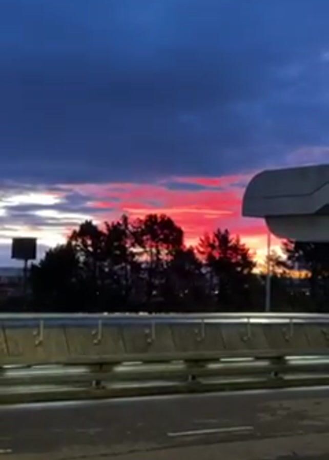 - "vivid, dark red and pink sunset sky framed by the silhouetted outlines of trees, seen from what appears to be an overpass or elevated road" by FM-euyLP2, licensed under CC BY 4.0