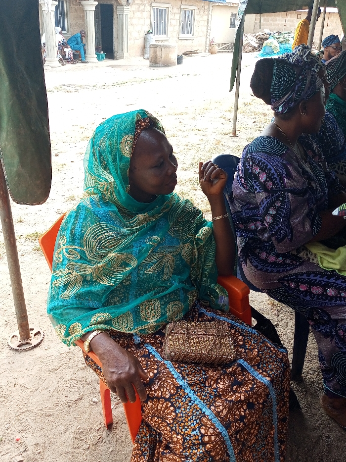 An outdoor scene in Erin-osun, Nigeria, features multiple individuals gathered under temporary shade structures, with a single-story residential building in the background. In the foreground, a dark-skinned woman is seated on an orange plastic chair, facing right with her head slightly turned to the right, suggesting attention to an off-camera subject. She wears a vibrant teal head covering with gold floral embroidery, a brown and blue patterned dress or skirt with blue trim, and gold-colored bracelets on both wrists. A small, rectangular, gold-colored woven clutch bag rests on her lap. Her right hand is raised, with fingers partially curled. To her right, a second woman is partially visible, also seated, wearing a purple patterned garment and a matching headwrap. She faces the same direction as the foreground woman. The background reveals a light-colored concrete building with multiple windows and a central dark doorway. A circular concrete structure, possibly a well, stands in front of the building. Several individuals are seated or standing near the building, including one person in a blue garment seated near the doorway and a child nearby. The ground is composed of light-brown dirt or sand. A dark fabric tent or awning is visible in the top left, supported by a metal pole with a circular base plate.