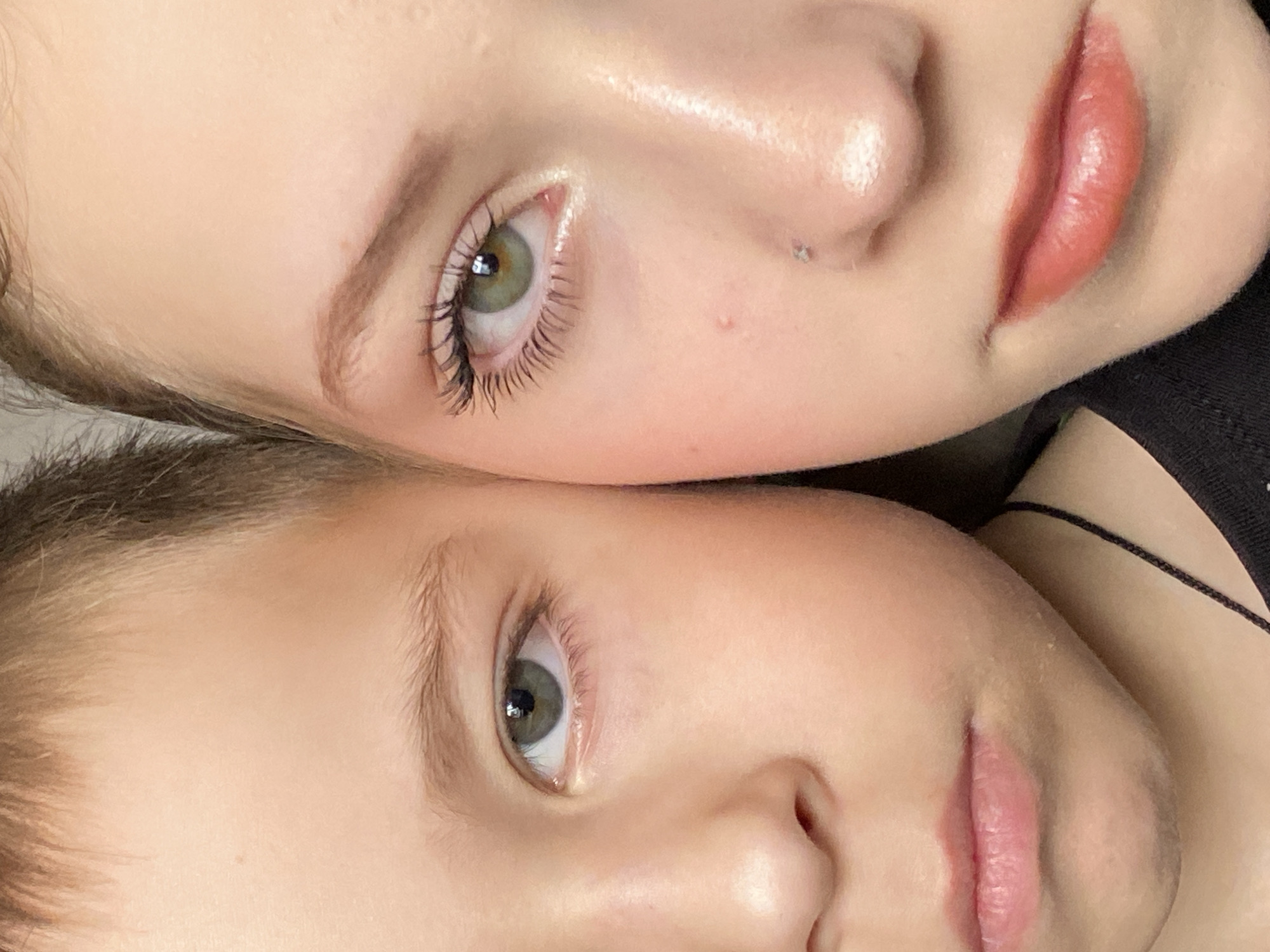 Two individuals are closely positioned, their faces nearly touching. The top individual has clear skin, a nose piercing, and green eyes with well-defined eyelashes. Their lips are painted with a glossy, reddish-pink shade. The lower individual, likely younger, also has green eyes and fair skin. A portion of a black garment and a thin necklace string are visible on the right side. The location is not discernible from the image.