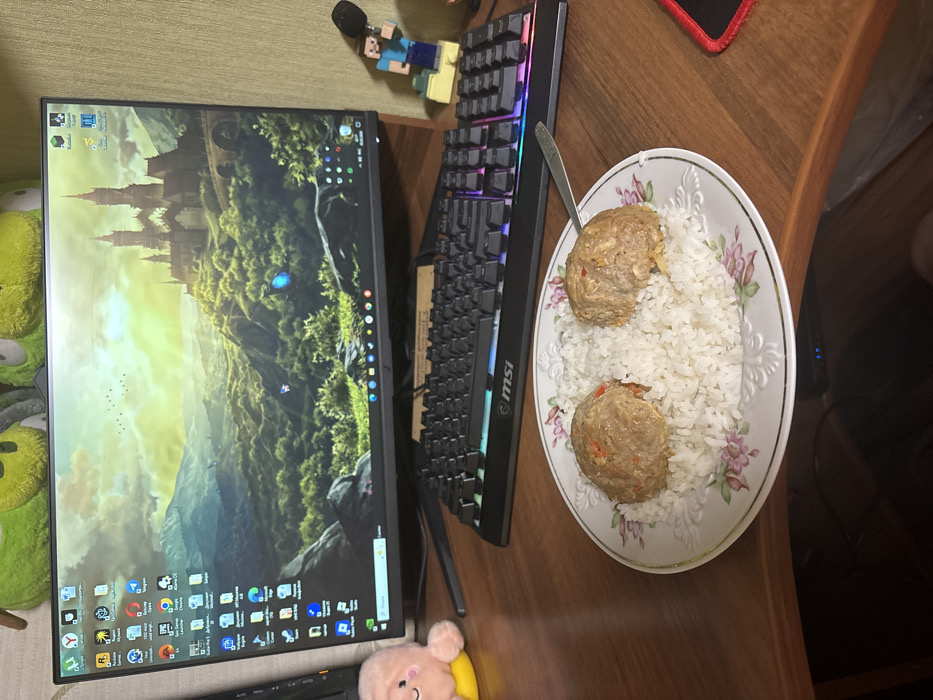 An indoor scene depicts a wooden desk setup within what appears to be a residential space in Russia, indicated by Russian language icons on the computer desktop, aligning with the specified location of Rostov-on-Don. In the foreground, a white ceramic plate with a floral pattern (pink flowers, green leaves, gold rim) rests on the light brown wooden desk. The plate holds a portion of white rice, topped with two large, round, light brown meat products, possibly cutlets or meatballs, containing visible red and orange inclusions. A silver spoon is positioned on the right side of the plate, partially embedded in the rice. A red-edged mousepad is partially visible on the desk to the far right. The midground features a black mechanical gaming keyboard with multicolored RGB backlighting, bearing the "MSI" brand logo. Behind the keyboard is a black computer monitor displaying a fantasy landscape wallpaper featuring a castle on a hill amidst green foliage, mountains, and a bright yellow-orange sky with small birds. The monitor screen shows numerous desktop application icons, some of which are in Russian. To the left of the monitor is a small, light pink, cloud-shaped plush toy with a yellow base. To the right, a small "Minecraft Steve" figurine stands on a block-like base, holding a black accessory. The background shows a light-colored, possibly textured, wall wallpaper. Above the monitor, several partially obscured plush toys, primarily green and yellow, are visible. No people are visible, and no direct actions or interactions are depicted beyond the implied use of the computer and consumption of the meal. The environment suggests a personal workstation or dining area.