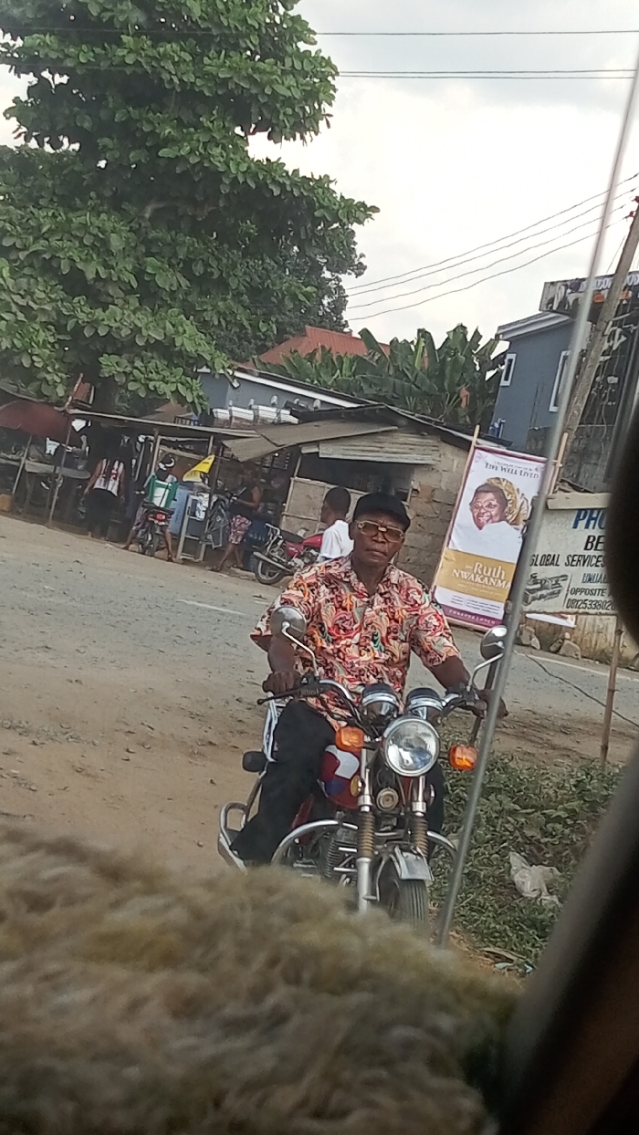 A man wearing a colorful shirt and sunglasses rides a motorcycle on a dirt road. In the background, there are simple shops and a poster with a portrait of a woman. Trees and buildings are also visible in the background. The foreground shows part of a vehicle interior, possibly a car or bus.