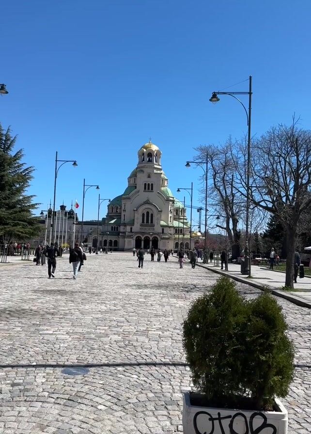 Alexander Nevsky Cathedral in Sofia, Bulgaria on a sunny day. The camera slowly zooms in. The cathedral is large and ornate, with multiple domes and towers. The domes are covered in gold leaf, and the walls are decorated with intricate carvings. In front of the cathedral is a large square paved with cobblestones. Several people are walking across the square. There are lampposts on either side of the square, and trees are visible in the background. In the foreground, there is a planter with a small bush growing in it. The planter has graffiti written on it. A Bulgarian flag is seen. The sky is blue and cloudless.