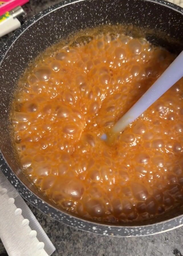 close-up overhead shot of a bubbling, amber-colored liquid in a speckled black pot