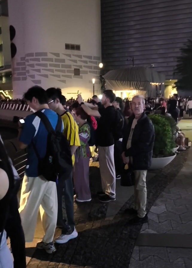 A crowd of people are gathered on a brick-paved area, likely a sidewalk or pedestrian zone. Many people are standing in line. Some are looking ahead, while others are observing their surroundings. One individual is holding up his arm, potentially taking a photo or video with their phone. The crowd extends into the distance, suggesting a significant event or attraction. Buildings, one of which has a textured design, surround the area, and there are street lights illuminating the scene. Plant boxes add greenery to the urban environment. The atmosphere suggests an evening or nighttime gathering.
