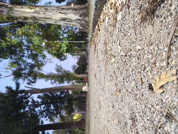 A ground-level view focuses on a gravel path lined with dried leaves and twigs. Trees, their trunks thick and branches reaching towards the sky, border the path. Streetlights illuminate the scene, creating a soft glow in the distance. The sky is tinged with twilight colors, suggesting either dawn or dusk. The image captures a quiet moment in a park or garden.