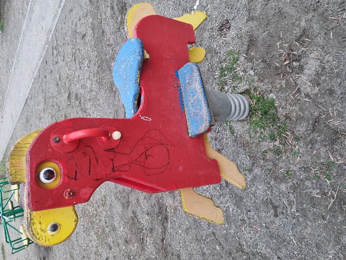 - "A red, yellow, and blue wooden horse-shaped spring rider stands stationary on a dirt and sand playground surface in Krasnodar, Russia" by FM-MGDNO2, licensed under CC BY 4.0