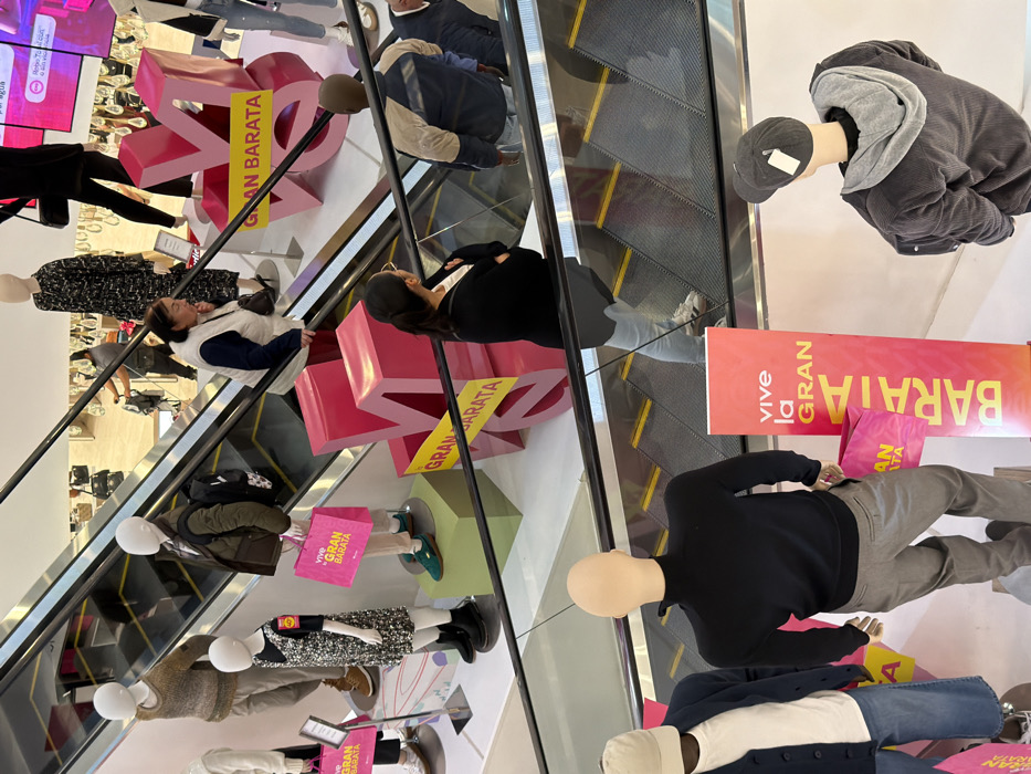 n indoor shopping mall scene. Several mannequins are dressed in various outfits alongside an escalator. Sale signs in Spanish read "GRAN BARATA" and "VIVE la GRAN BARATA". People are on the escalator, and the shot is taken at an angle, with mannequins on both sides. The color scheme is dominated by pink signs, neutral clothing colors, and the silver of the escalator.