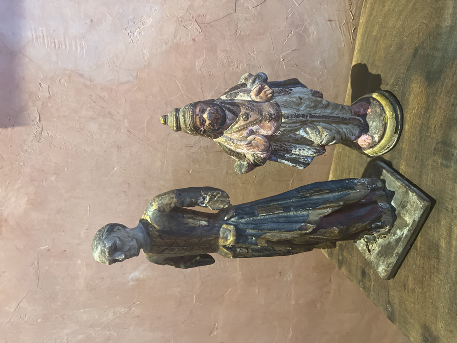 Two weathered, antique statues stand against a textured peach wall and a wooden surface. The lower statue, possibly male, has a weathered head and a dark, possibly blue, cloak. Gold detailing is visible. The upper statue, perhaps religious, features a crowned figure in lighter robes, with hands extended. Both figures display significant age and wear.