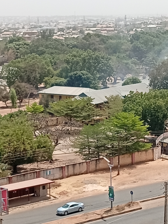 An elevated, wide-angle photograph depicts a daytime urban scene in Kakuri Gwari, Nigeria