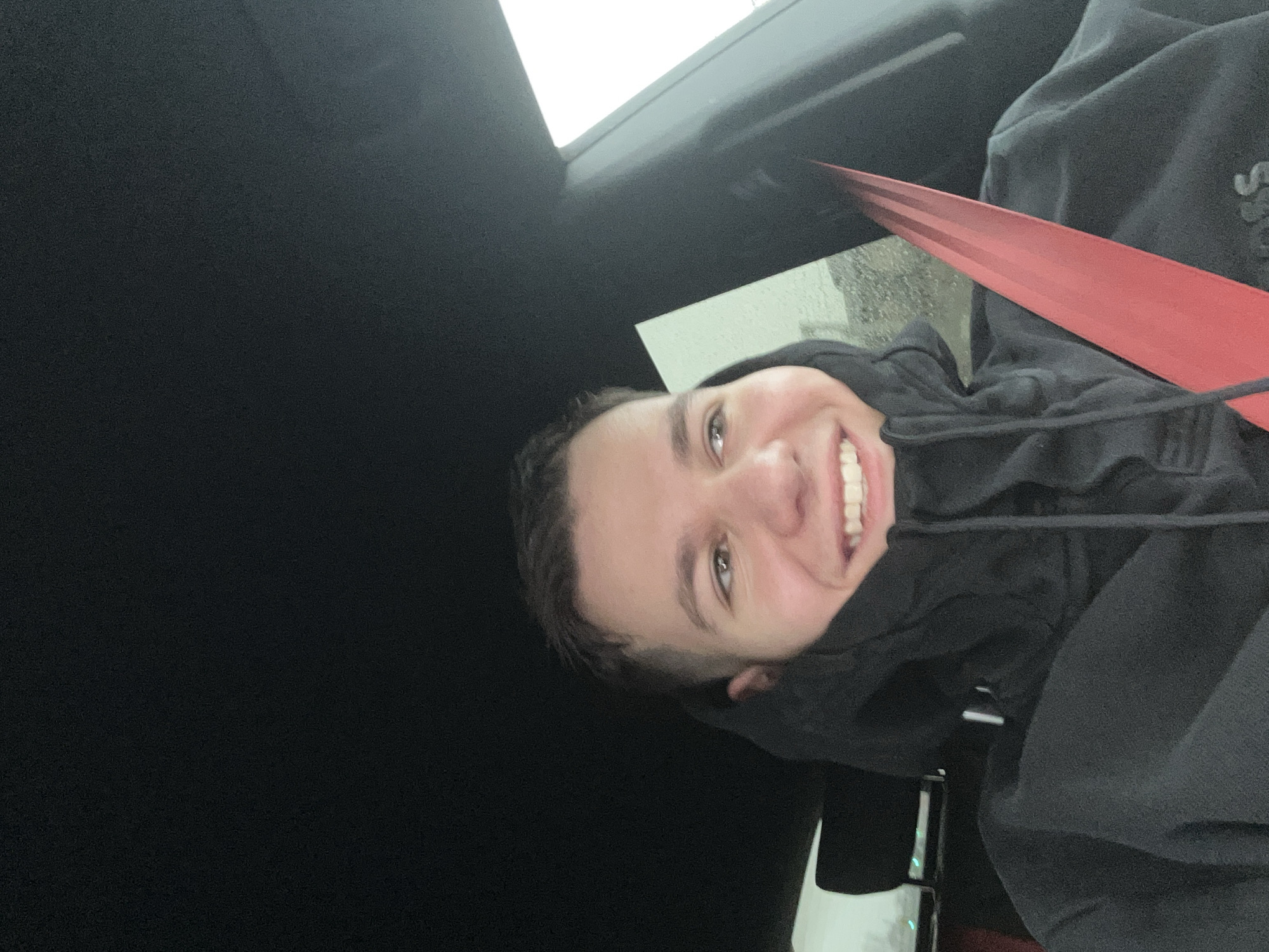 A smiling young adult male sits inside a vehicle, wearing a black hooded sweatshirt and a red seatbelt