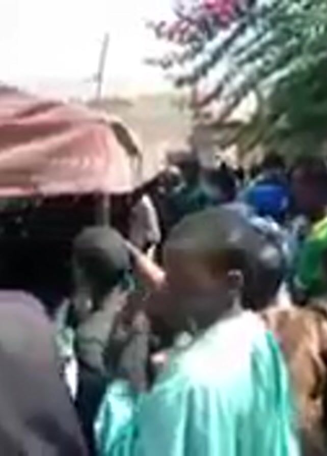 large group of people, mostly men, gathered under what appears to be an awning or a tent with a red and green cover. Many are wearing traditional clothing, including caps and robes. The scene is crowded and the camera moves, showing various individuals within the group. The setting appears to be outdoors, possibly at a market or a public gathering.
