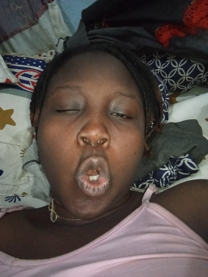 A person with dark skin lies on patterned bedding. Their eyes are partially closed, one more than the other. Their mouth is open in a wide "O" shape, revealing teeth. The person wears a light pink top with thin straps and a delicate necklace. A pile of clothes is in the background, partially obscuring the bedding. The overall impression is casual and somewhat playful.
